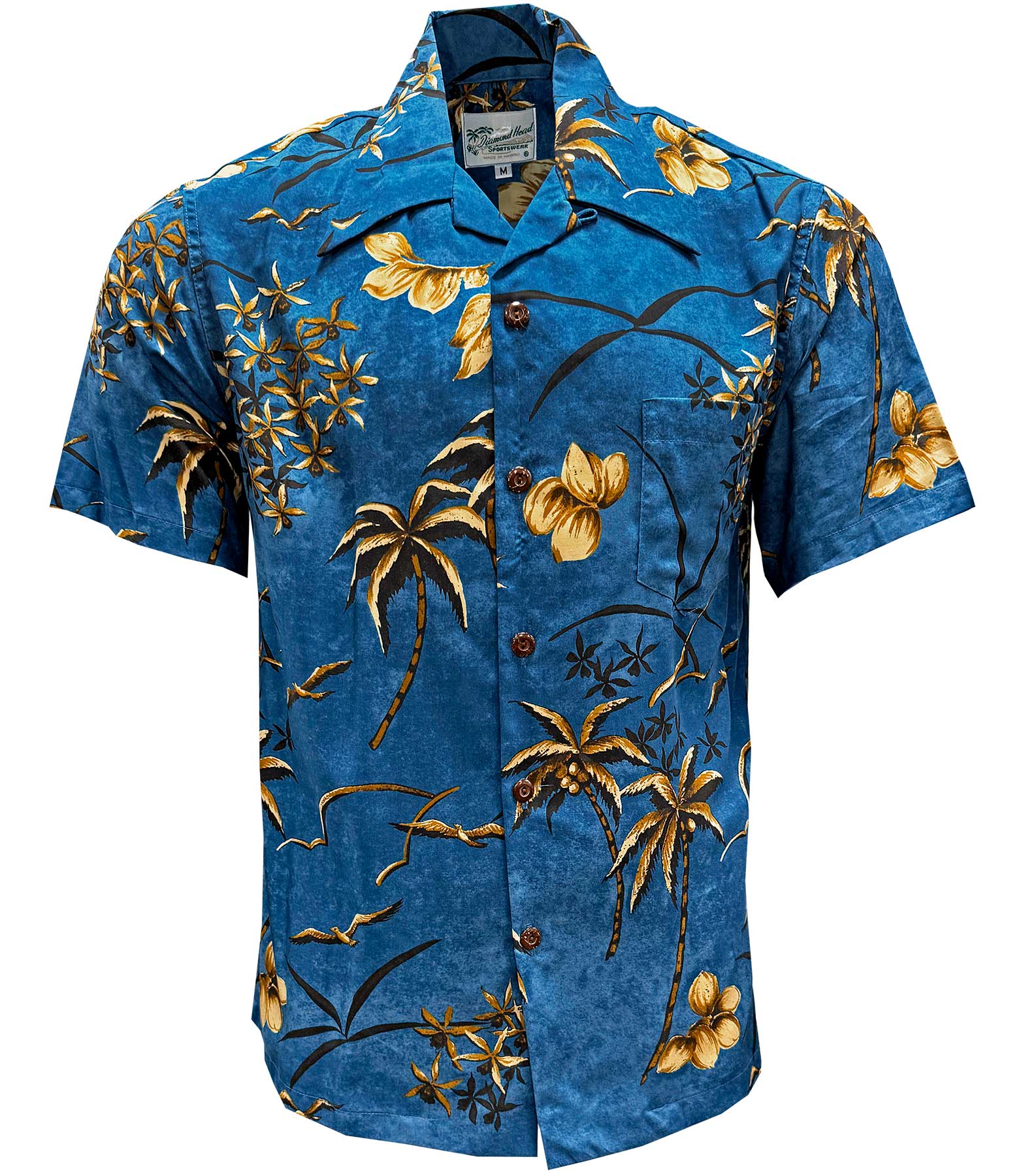 Experience a luxurious blast from the past with this Retro Oasis Cool Water shirt by Diamond Head Sportswear. Adorned with vintage-style palm trees and soaring sea birds, this retro aloha shirt will give you a timeless, tasteful style that is perfect for any occasion.