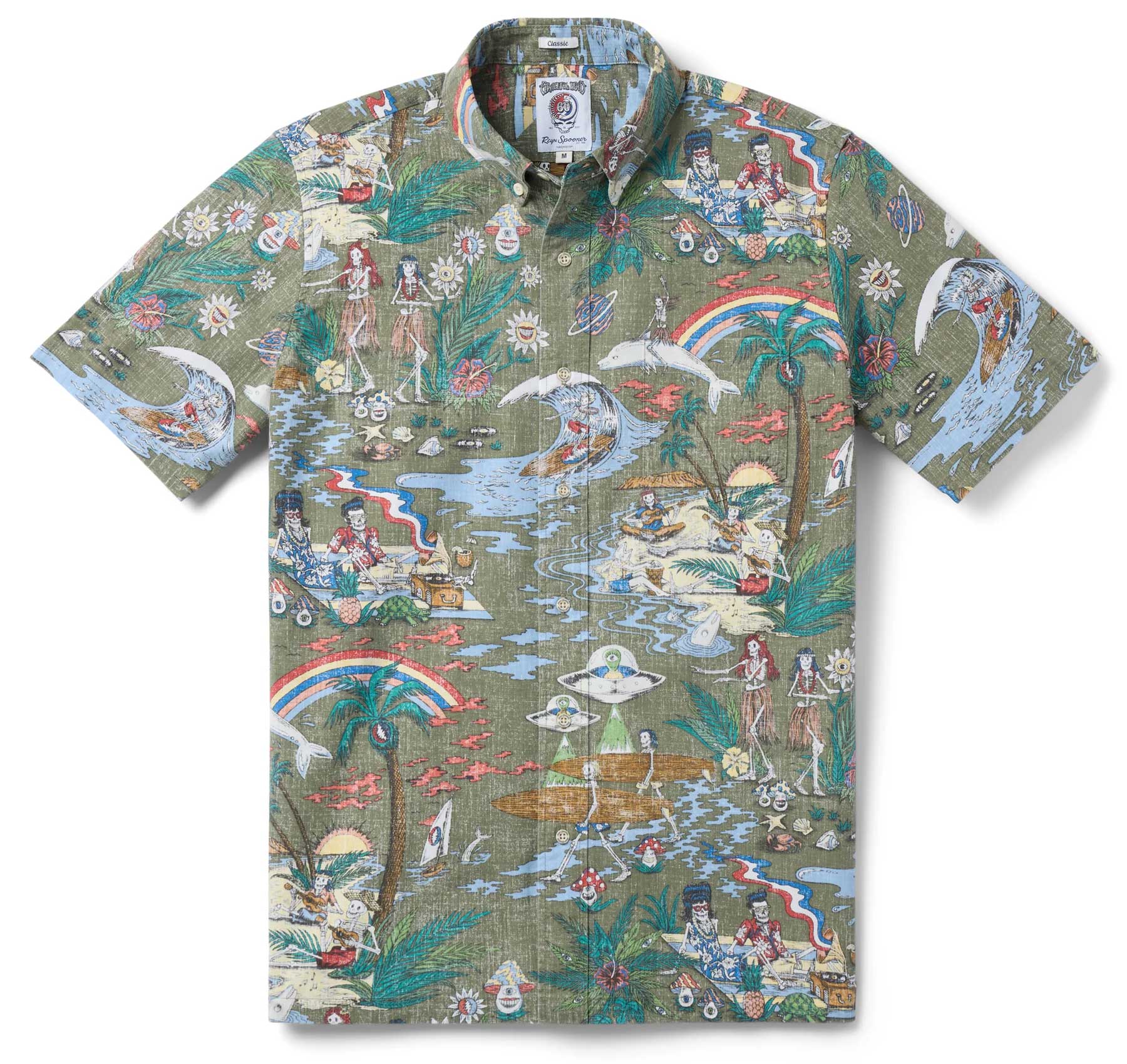 Far Out! Can anyone have more fun in Paradise? Renowned artist, Dan Van Patten, designed this whimsical shirt. His Grateful Dead album recently won a Grammy. In this print, he created a "Hawaii themed Fantasy-land in Another World" featuring UFOs, flying dolphins, surfing Bertha, and more.