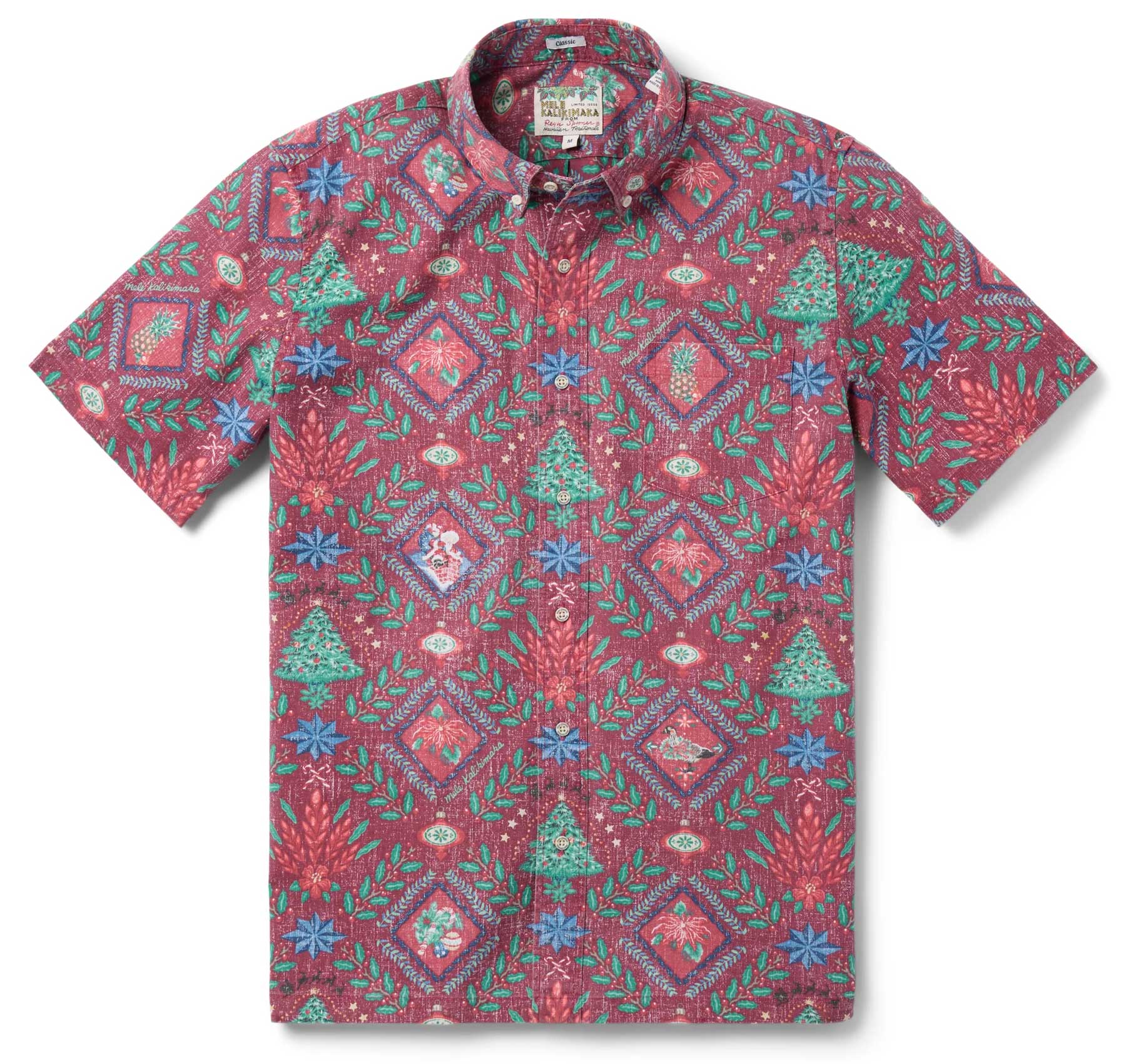 Reyn Spooner designers referenced vintage Hawaiian quilt, patchwork, and embroidery when creating this 2025 Hawaiian Christmas print. The design features holly, hibiscus, poinsettias, and a holiday tree along with Santa and his reindeer. If you look closely, you may spot the year of the print hidden in this design. Mele Kalikimaka!